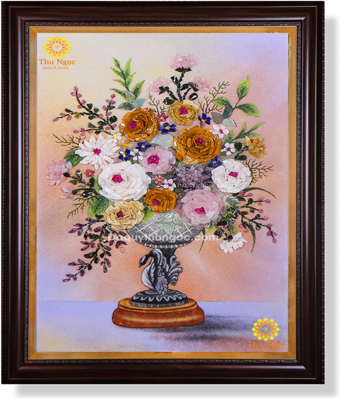 – Mô tả: Tranh tĩnh vật hoa này được làm từ các loại đá Tự Nhiên 100% của các mỏ tại 3 miền Bắc Trung Nam Việt Nam, chất liệu kết dính là keo chuyên dụng gắn đá quý nhập khẩu từ Thái Lan.
